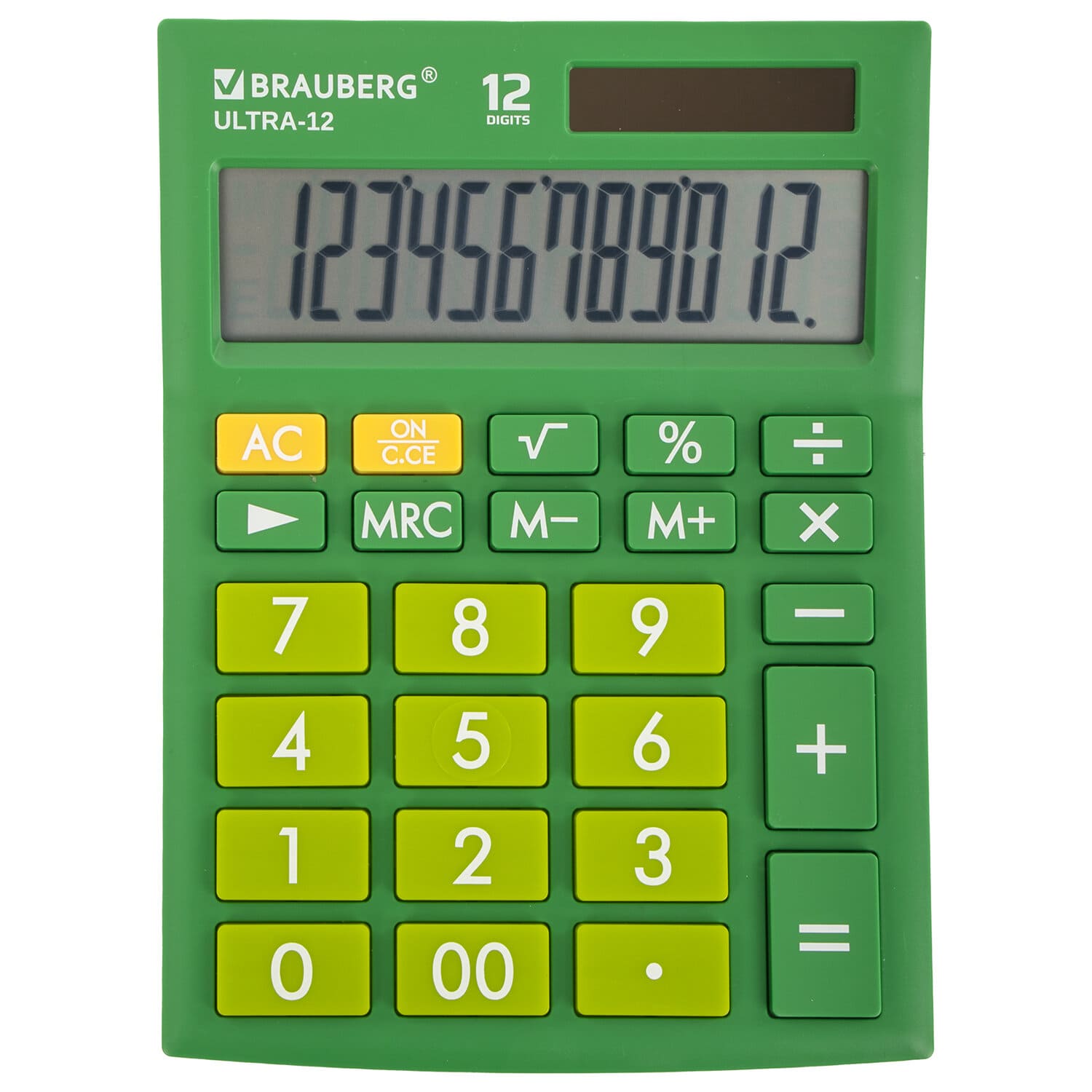 —Калькулятор настольный BRAUBERG ULTRA-12-GN, 12 разрядов, двойное питание, ЗЕЛЕНЫЙ, 250493