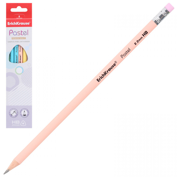 Карандаш чернографитный Erich Krause Pastel HB с ластиком, трехг., ассорти, европ.,56006