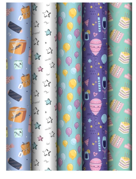 Упаковочная бумага глянц. 70х100 см, MESHU 'Birthday mood', 80 г;м2, ассорти, 5 дизайнов, MS_62815