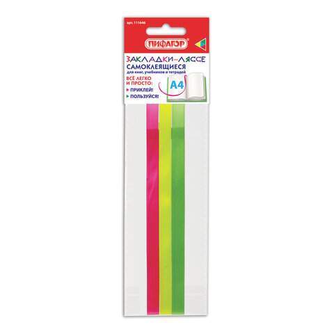 —Закладки ляссе А4, 'Пифагор', неон, для книг, клейкий край, 3 ленты, 111646